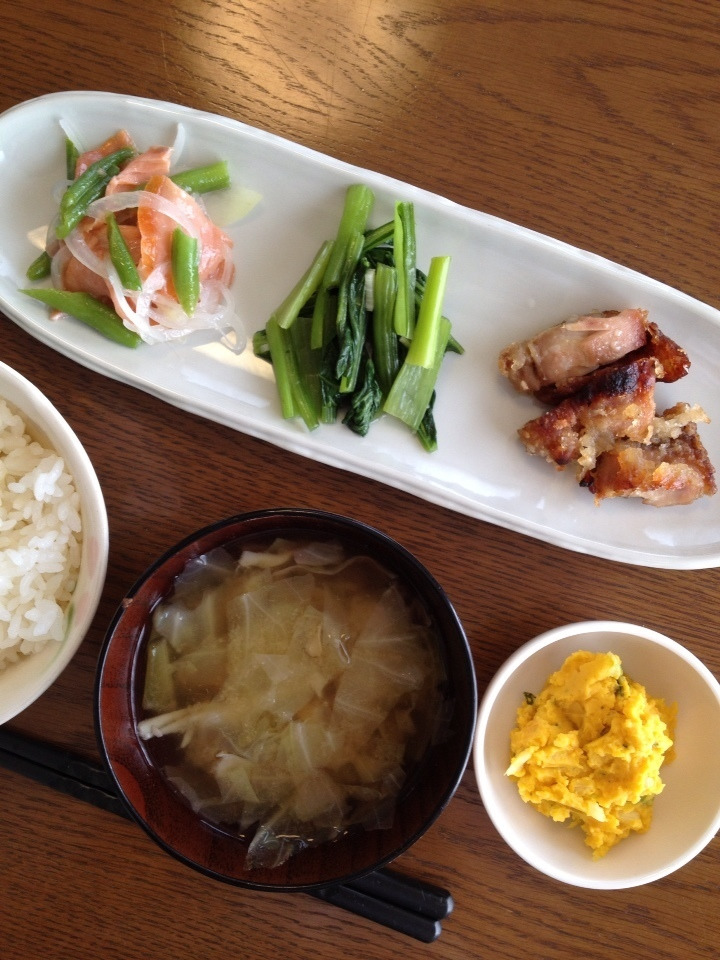 あとは小松菜のガーリックソテー、サーモンマリネ(今作った)、カボチャサラダです。