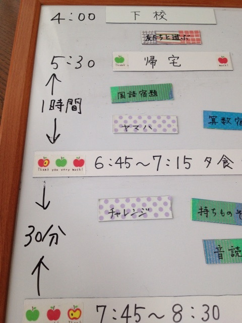 夕食とお風呂の時刻を固定して、その前後に「算数宿題」「国語宿題」「持ち物そろえ」「ピアノ」「チャレンジ(通信教育)」「片づけタイム」などを配置します。