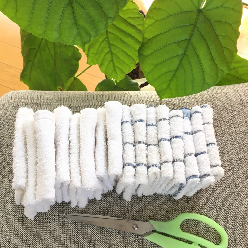 ストックがなくなってきたので、使い古しタオルをチョキチョキして、使い捨て布を作りました。