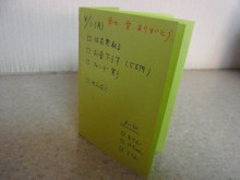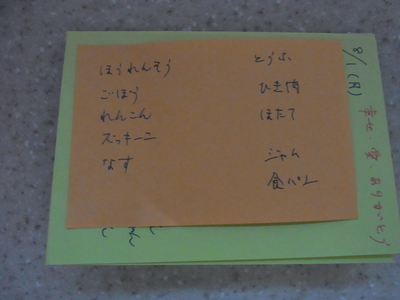 買うものが多いときは7.5センチ×5センチの付箋に書きます。こうするとぴったり(B5の紙を使った場合)。