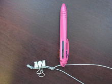 この小さい輪っかの片方の紐をダブルクリップで挟みます。ペンは動きが自由になっているので、こうやってそばに寄せることができます。