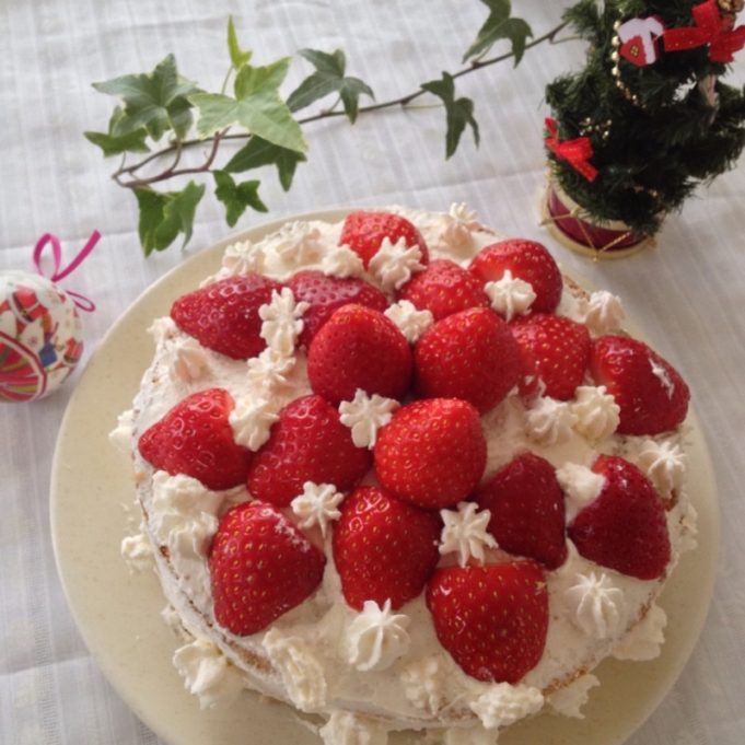 イチゴを飾るのもクリームを絞り出すのもすべて娘が一人で頑張り、出来上がったケーキ。