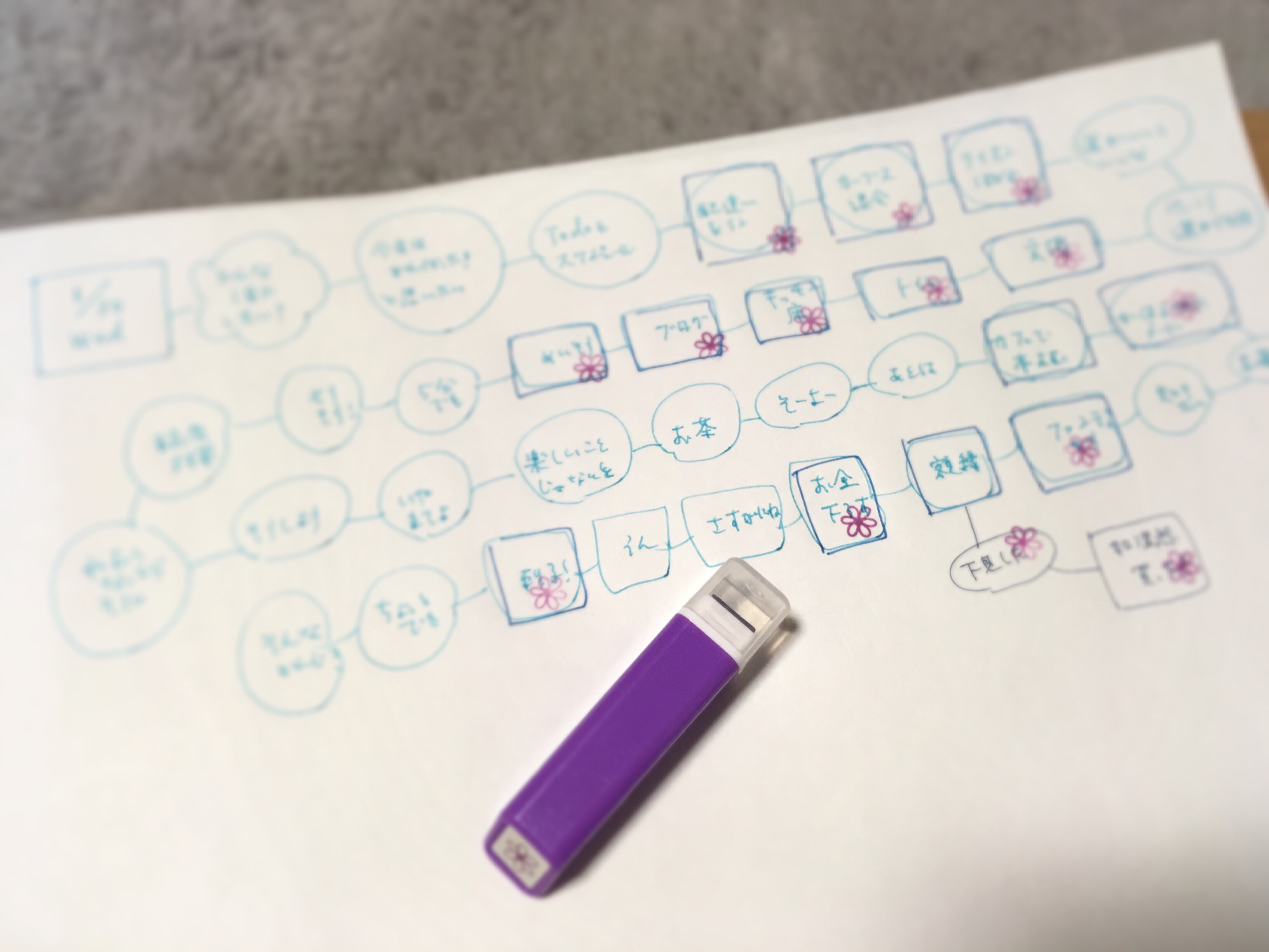 頭の中に浮かぶことを、吹き出しみたいな枠の中に書いてつなげていくというシンプルな方法なのですが、使い道は無限大。