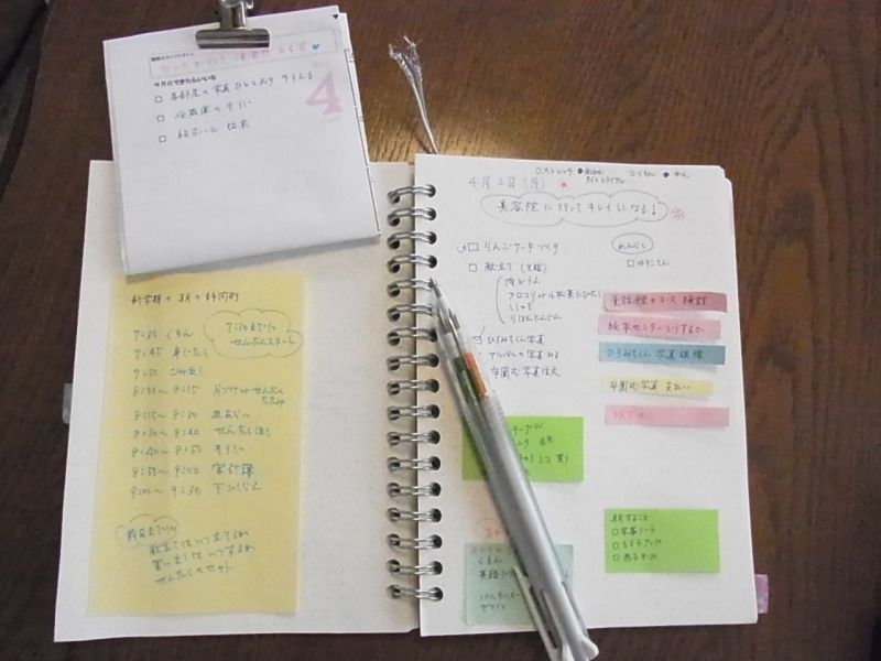まだ仮の時間割なので、手のひらサイズの付箋に書いて、家事ノートの左ページに貼りました。