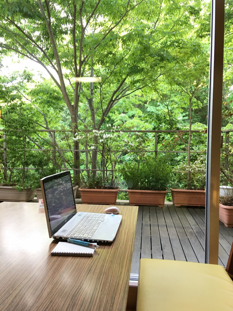 新緑が目に美しく、窓の外の景色が気持ちよいです。