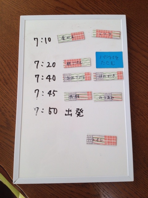 両面マグネットに「着替え」「朝ごはん」「歯みがき」などの項目を書き、終わったら裏返すというものです。
