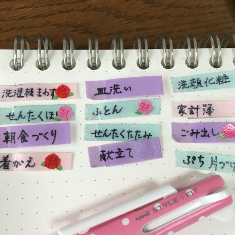 朝家事の項目を、1枚ずつの付箋(使いまわしができるようにマスキングテープで作成)に書いて、終わったものから剥がしています。