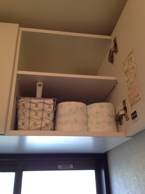 それで一回り小さいかごに、トイレ掃除用のものだけまとめたら、かごが小さいのでトイレの収納棚の中に入りました。
