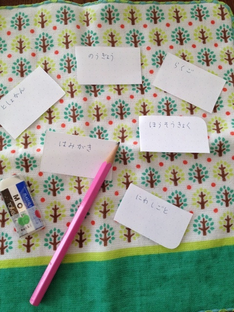 こんなふうに小さい紙切れに問題を書き、娘に「くださいな、にわしごとくださいな」などと言いながら渡します。