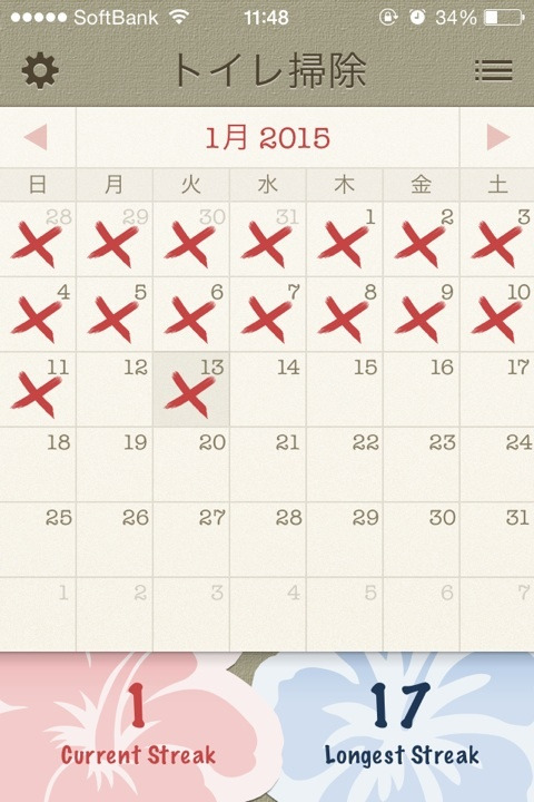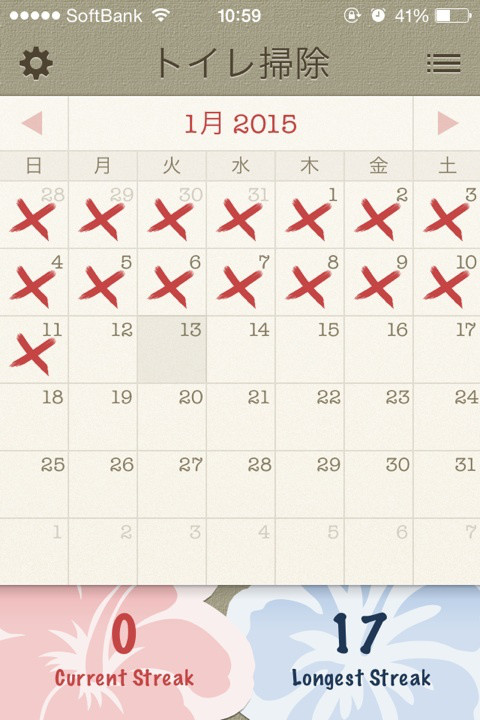 去年まだこのアプリを使っていない時期に50日以上連続してできたのですが、今は時々途切れてしまって現在最高17日間連続です。