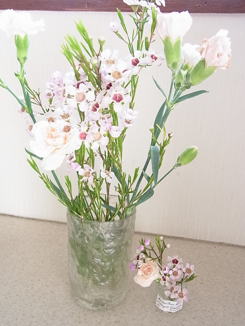 今は時節柄、お花の持ちはよくないけれど、せっかく買ったお花は、なるべく有効に活用しようと思って、2つに分けて飾ることにしています。