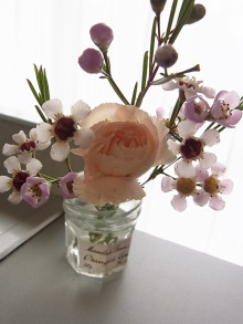 小さい方は、高さ4センチほどのミニジャムの瓶。地味目な花でもなぜかオシャレに見えます。