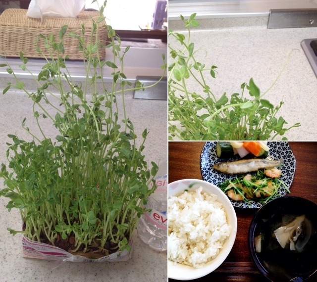 スーパーで買った豆苗、根元から切って使っても、お水入れといたらまた育つんだって。