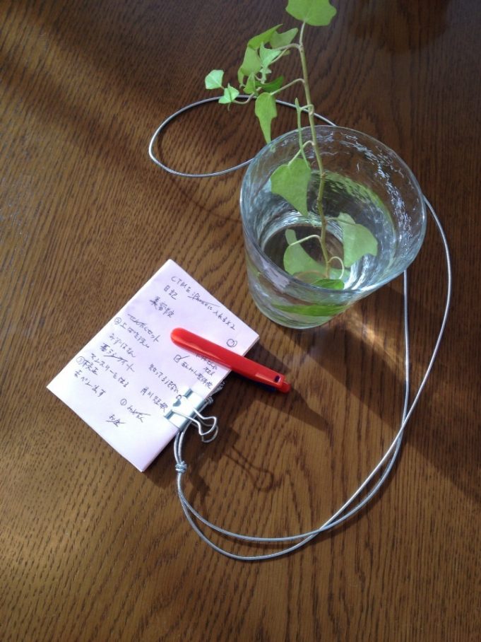 細いゴム紐にダブルクリップを結び、メモを挟み、そこにクリップ式のボールペンをくっつけます。
