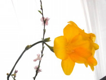 ところが今年は、桃との組み合わせがフリージアやスイートピーという不思議な花束を買ってしまいました。