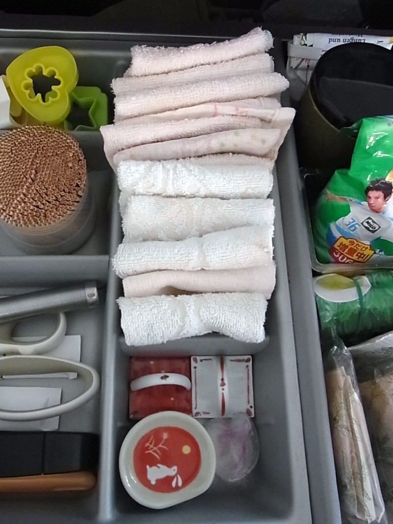 ウェスの置き場所はお茶類や箸置きなどに囲まれて、キッチンの引き出しの中。