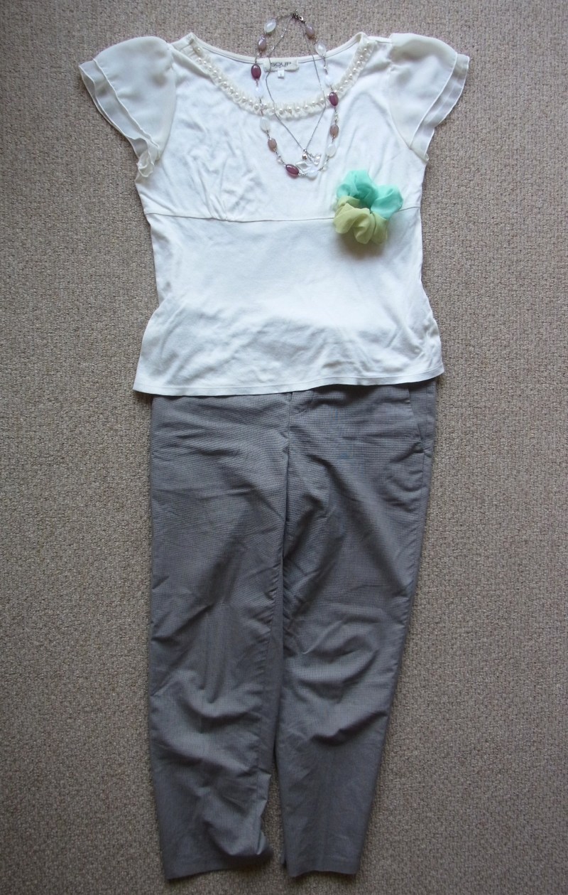 上もひらひらを合わせたら、何だかちょっと甘すぎるような。むしろ下はシンプルパンツの方がいいような気がしたのです。(一番上のコーデと比べてどうですか?)