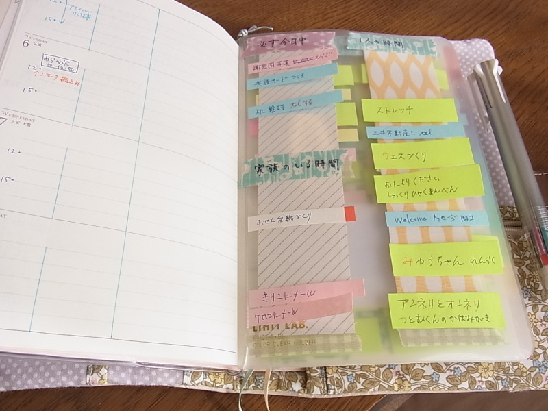 100均で10枚入りのプラスチック制インデックスシートを買ってきてぴったりサイズにカットするとA5サイズのバインダーに出し入れ自由になりました。2枚重ねにして1枚目には今日明日中にやるようなことを書いて貼り付け、次の列には今週中くらいのことを貼り付け、だんだんずらすようにしています。