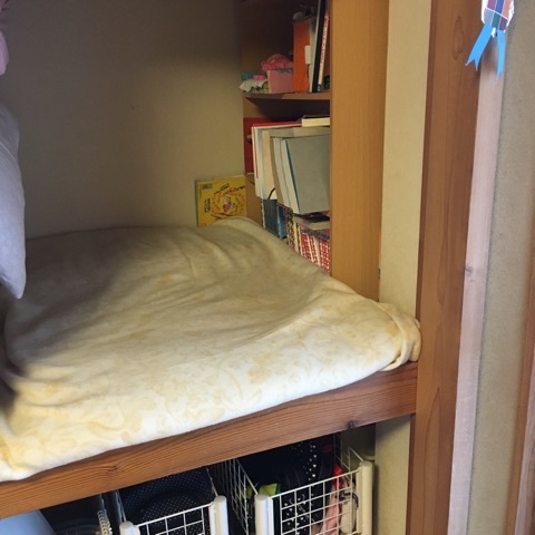 上段の半分は布団で占められていて、残りの半分は収納として使えない事情があるのです。