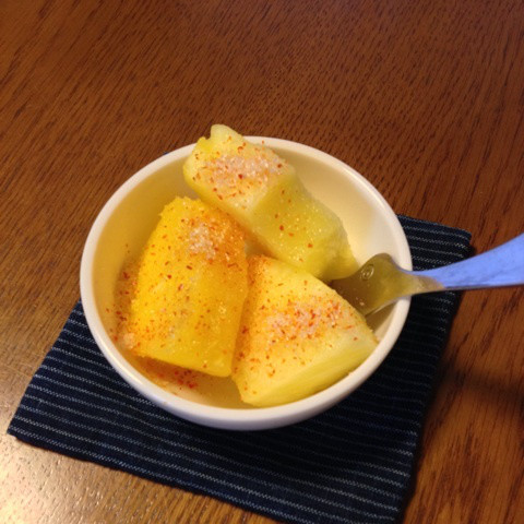 びっくりしてすぐに粉唐辛子とパイナップルを買ってきて、砂糖は家にあったので唐辛子と混ぜて、パイナップルにかけてみました。