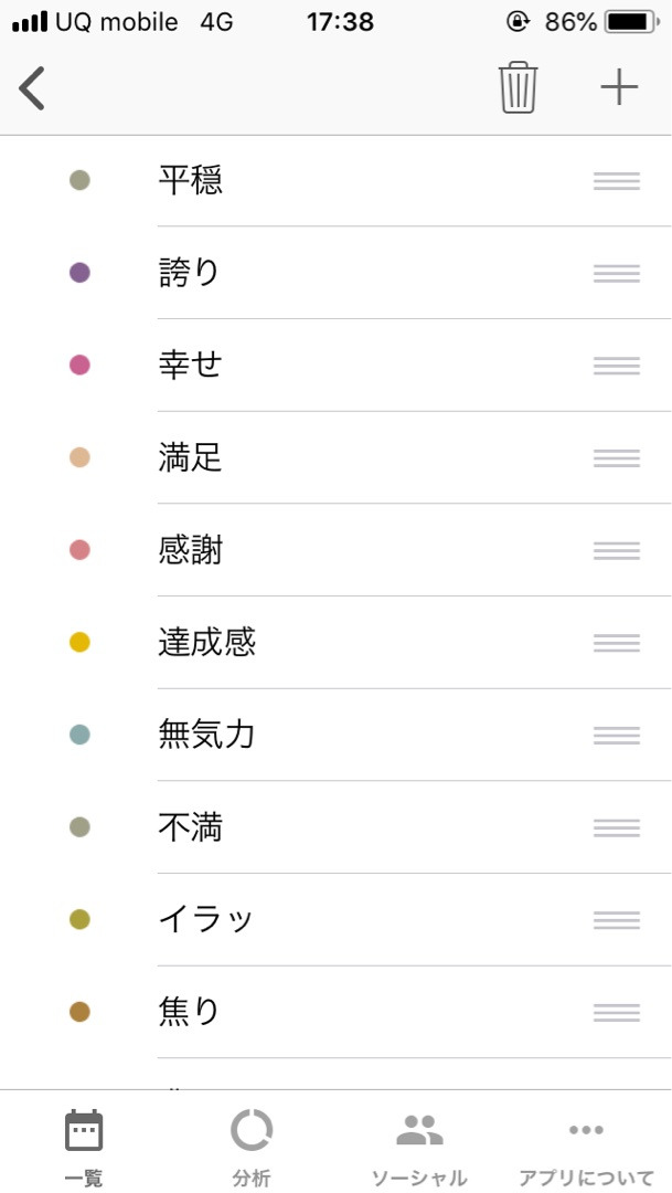 リストにない感情を付け足すこともできるので、自分がどんな感情を持ちやすいのか、考えるきっかけにもなりますね。