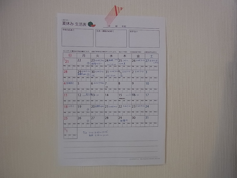 プールの予定(なぜか日によって時間帯が違う(>_<)や、学校図書室が開いている日、旅行など書き込んだら、見通しがよくなりました。