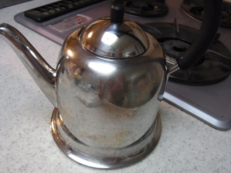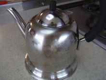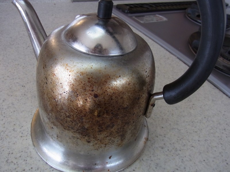 それはやかんを大鍋に入れ、重曹入りの熱湯で数分間ぐつぐつ煮ること。